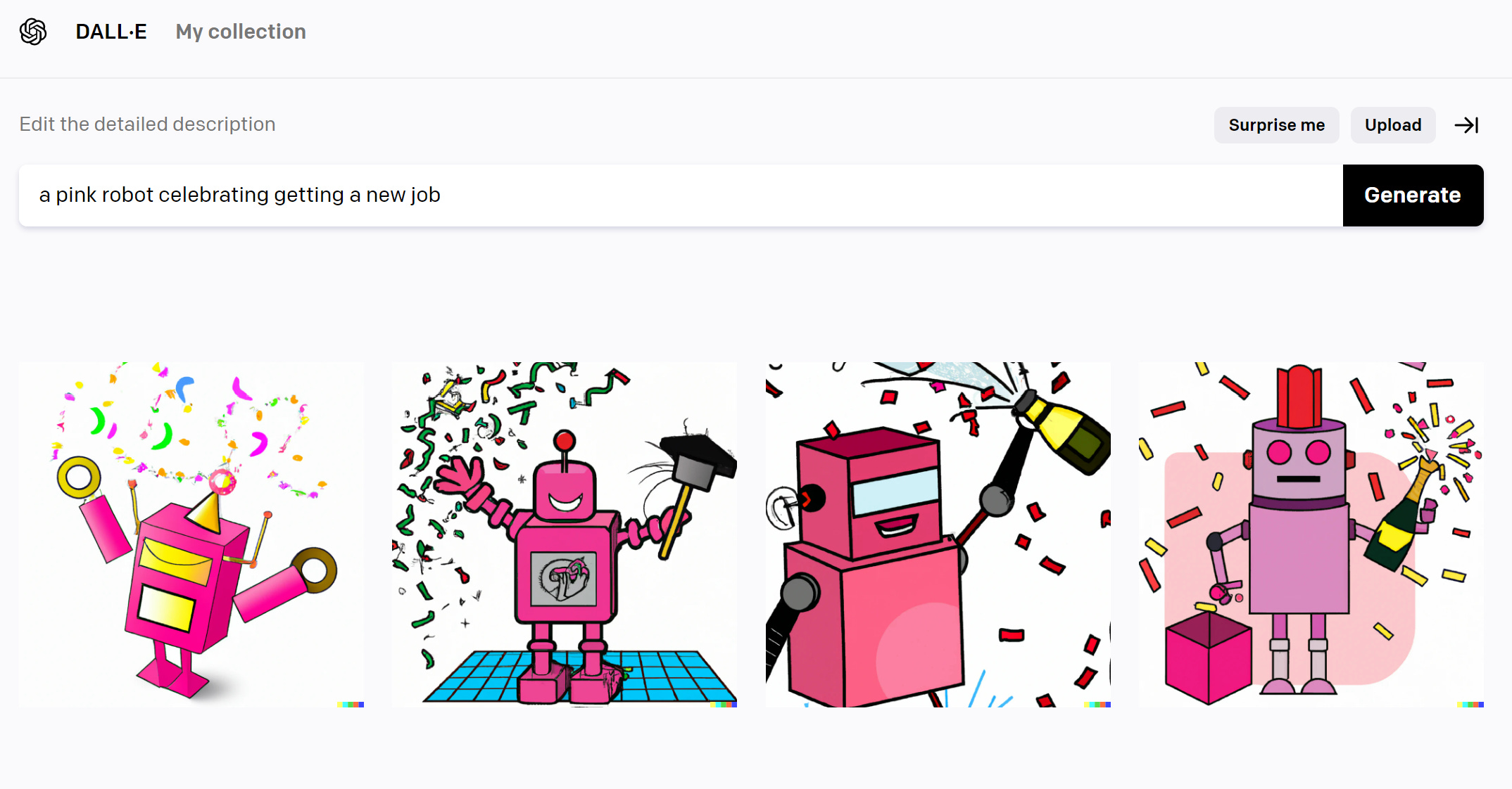 In the picture bellow you can see an example of what DALL-E has been working on for this post. It’s an illustration of DALL-E celebrating after hearing the news of being hired by Hani’s Newsletter.