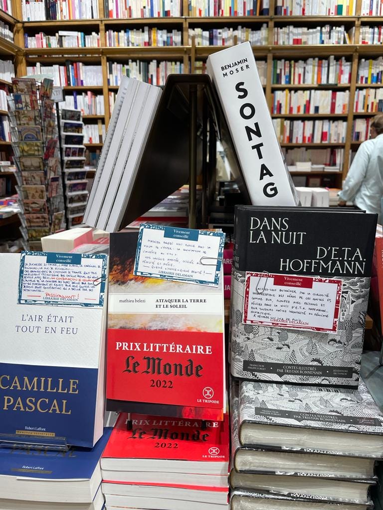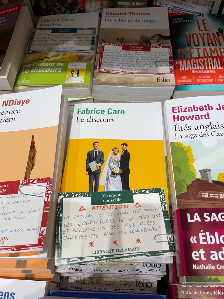 I randomly strolled into “Librairie Delamain” in Paris last night and noticed little paper notes on some of the books. The employees had taken the time to write small reviews.