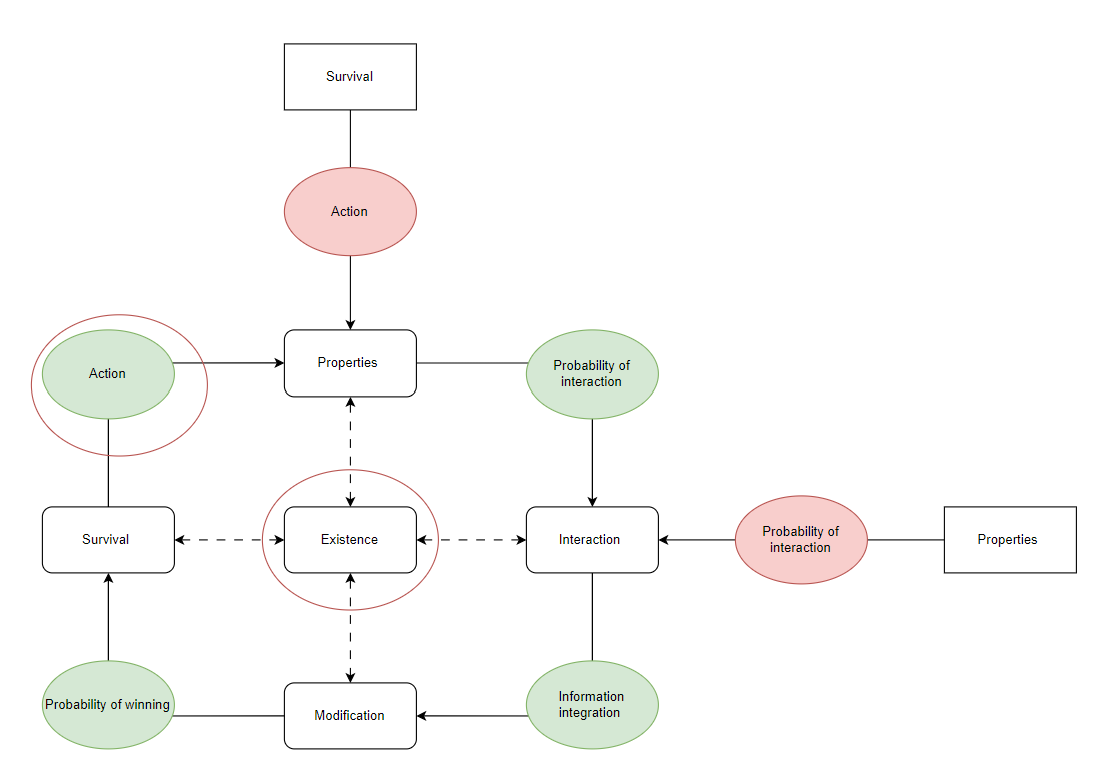 This is exactly what the following chart predicts. Action (in green) is the driver for existence. Action (in red), is the reason why you can’t predict human behaviour directly. By focusing on action (in green) you can maximize the probability for an existence to be. At the same time action (in red) will always remain hidden and out of reach.