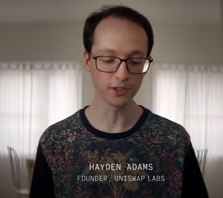 Hayden Adams is the creator of Uniswap. If I’m not mistaken Uniswap is currently the most used decentralized cryptocurrency exchange platform. In other words the entire thing works with smart contracts, there is no intermediary, it’s only code. Funny story, the idea about this platform actually came form Vitalik Buterin and Hayden was the one who decided to build it.