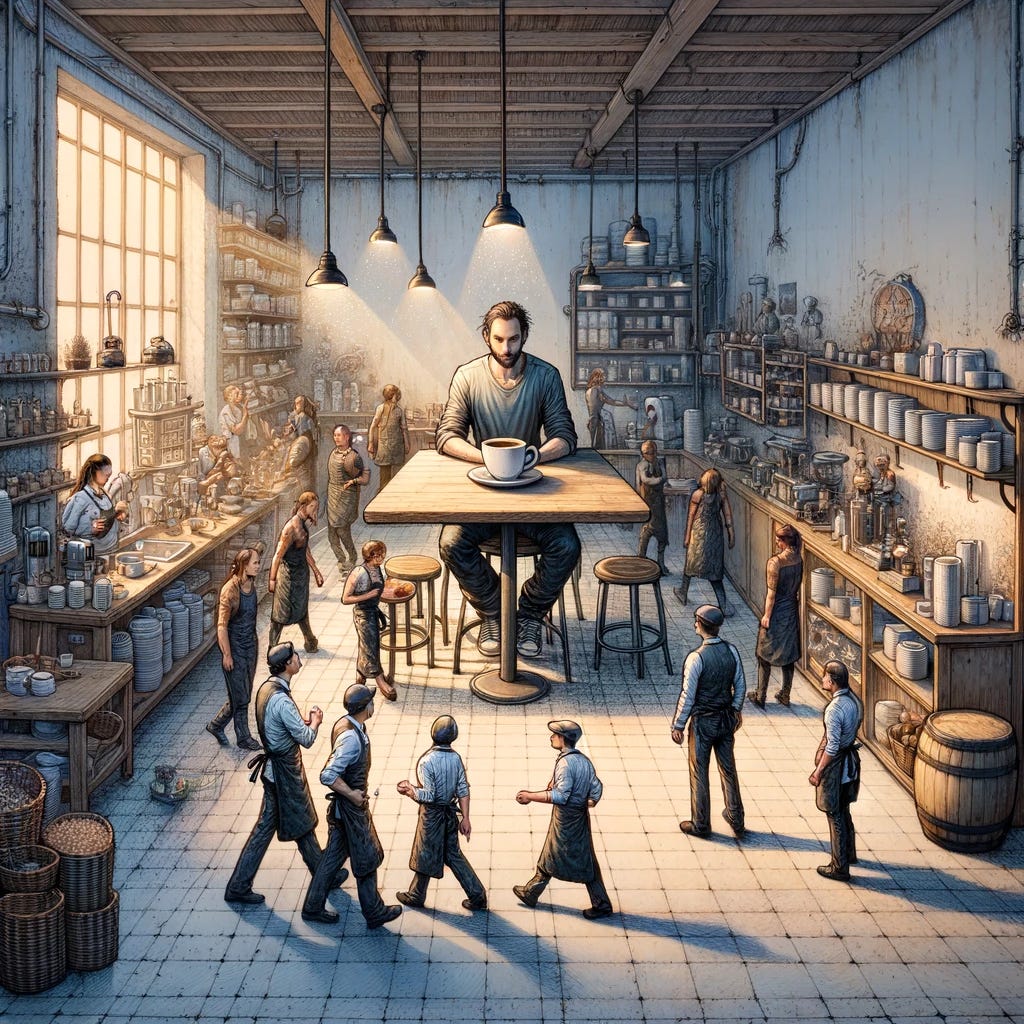 Maybe there is a rule at this coffeeshop that each waitress is responsible for a certain number of tables. And on Wednesdays, the tiny waitress is responsible for my table. This explains why all waitresses besides the tiny one did not take my tray. The tiny waitress loved playing waitress with her brothers and sisters as a child but one day while playing she fell over and a knife that she was carrying stabbed her left eye and another knife cut a nerve in her right arm. She was rushed to the hospital but lost her left eye, which was replaced by a glass eye which restricts her field of vision to what's in front and on the right of her. She also lost the capacity to lift her right arm. Since she loved being a waitress before her accident, she pursued her dream and decided to become a waitress for a living with or without a functioning left eye and right arm. Today, when walking from the kitchen to the storage room to the back of the shop, she simply ignores what’s on the left of her because she doesn’t see it but registers what’s to her right to pick it up on the way back with her left arm. In a way, she does the seeing on her way to the back and the moving with her functioning arm on the way back to the kitchen. She doesn’t always do that but it's her preferred mode of operating, especially when the shop is not too busy and there is no hurry to bring a specific tray back, which was the case for my tray. I simply did not notice these details because I’m usually not staring at tiny waitresses’ eyes to see whether they are real or made out of glass. I also don’t randomly challenge people to lift both of their arms in front of me.